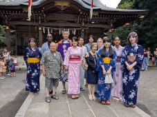 7⽉12⽇⼟曜⽇に「浴⾐を着て出かけよう」イベントを⾏ いました。⼤学⽣と寮⽣11⼈の参加がありました。まず、東村⼭市の⽇本語ボランティアの⽅と⼩平市の⽇本語ボランテ ィアの⽅に着付けのお⼿伝いをいただき、浴⾐に着替えまし た。次に着付けが終わった⼈から七⼣の短冊に願いを書いて もらいました。「試験に合格しますように」「健康であります ように」⺟国語で書かれた短冊もありました。全員が浴⾐に 着替え、近くの⼋坂神社例⼤祭に出かけました。