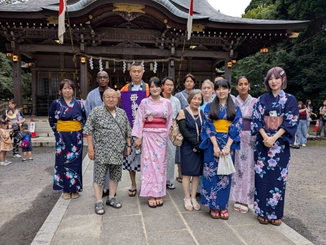 7⽉12⽇⼟曜⽇に「浴⾐を着て出かけよう」イベントを⾏ いました。⼤学⽣と寮⽣11⼈の参加がありました。まず、東村⼭市の⽇本語ボランティアの⽅と⼩平市の⽇本語ボランテ ィアの⽅に着付けのお⼿伝いをいただき、浴⾐に着替えまし た。次に着付けが終わった⼈から七⼣の短冊に願いを書いて もらいました。「試験に合格しますように」「健康であります ように」⺟国語で書かれた短冊もありました。全員が浴⾐に 着替え、近くの⼋坂神社例⼤祭に出かけました。