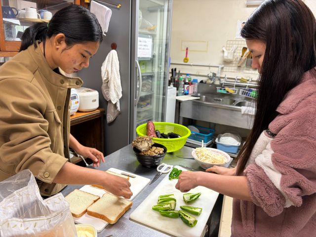 4月4日(土)は外の様子を見ながら、お花見のお弁当作りを早くから2名のミャンマーの寮生が手伝ってくれました。 あいにくの雨で予定していた「お花見」に行くことが出来ませんでした。